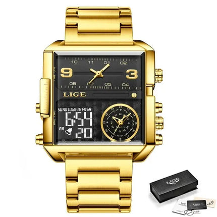 LIGE Luxury Original Men Sports Wrist Watch Gold Quartz Steel Waterproof Dual Display Clock Watches For Men Relogio Masculino
